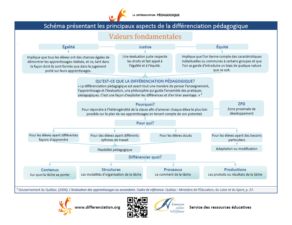 Le Centre de services scolaire des Affluents a créé il y a quelques années un site Web pour expliquer et suggérer des exemples de différenciation pédagogique. Voici un schéma qui résume bien l’esprit de la différenciation pédagogique.
