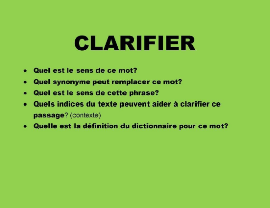 Clarifier, c’est prendre les mesures nécessaires pour comprendre les mots nouveaux et/ou les passages difficiles. Pour clarifier un texte, les élèves devront, entre autres, faire des inférences, comprendre des phrases ou des passages à l’aide du contexte, comprendre des mots de substitution, comprendre des mots nouveaux à l’aide du dictionnaire ou du contexte.