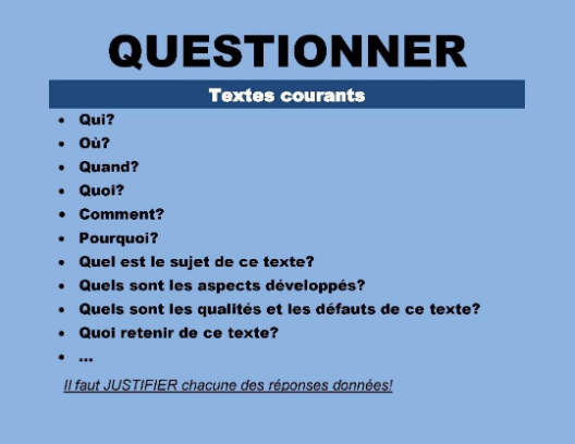 Questionner, c’est se poser des questions sur les informations importantes. Cela permet de vérifier si les informations importantes sont bien comprises et de faire une lecture en profondeur. Les questions à se poser pour les textes courants et les textes littéraires peuvent parfois diverger. Se questionner permet de rester actif tout au long de la lecture.
