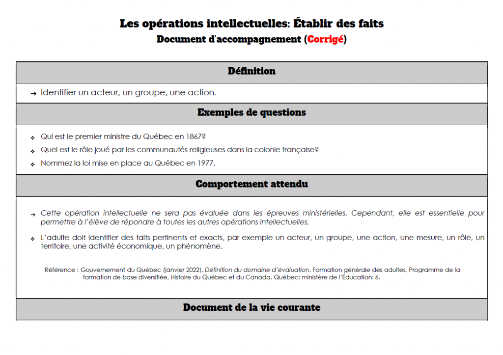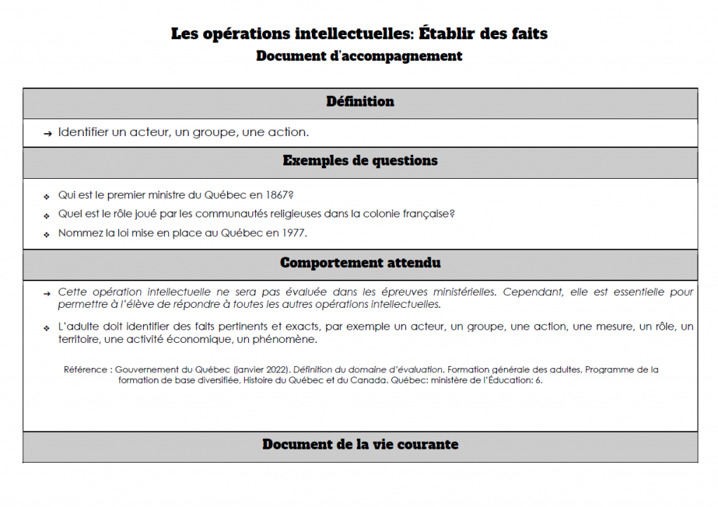 Contrairement aux sept autres opérations intellectuelles, aucune vidéo n’accompagne l’opération intellectuelle Établir des faits, car elle n’est pas évaluée. Nous vous recommandons tout de même de voir cette opération intellectuelle avec vos apprenant.es (avec les documents proposés ci-dessous) étant donné qu’elle est la base de toutes les autres opérations intellectuelles.